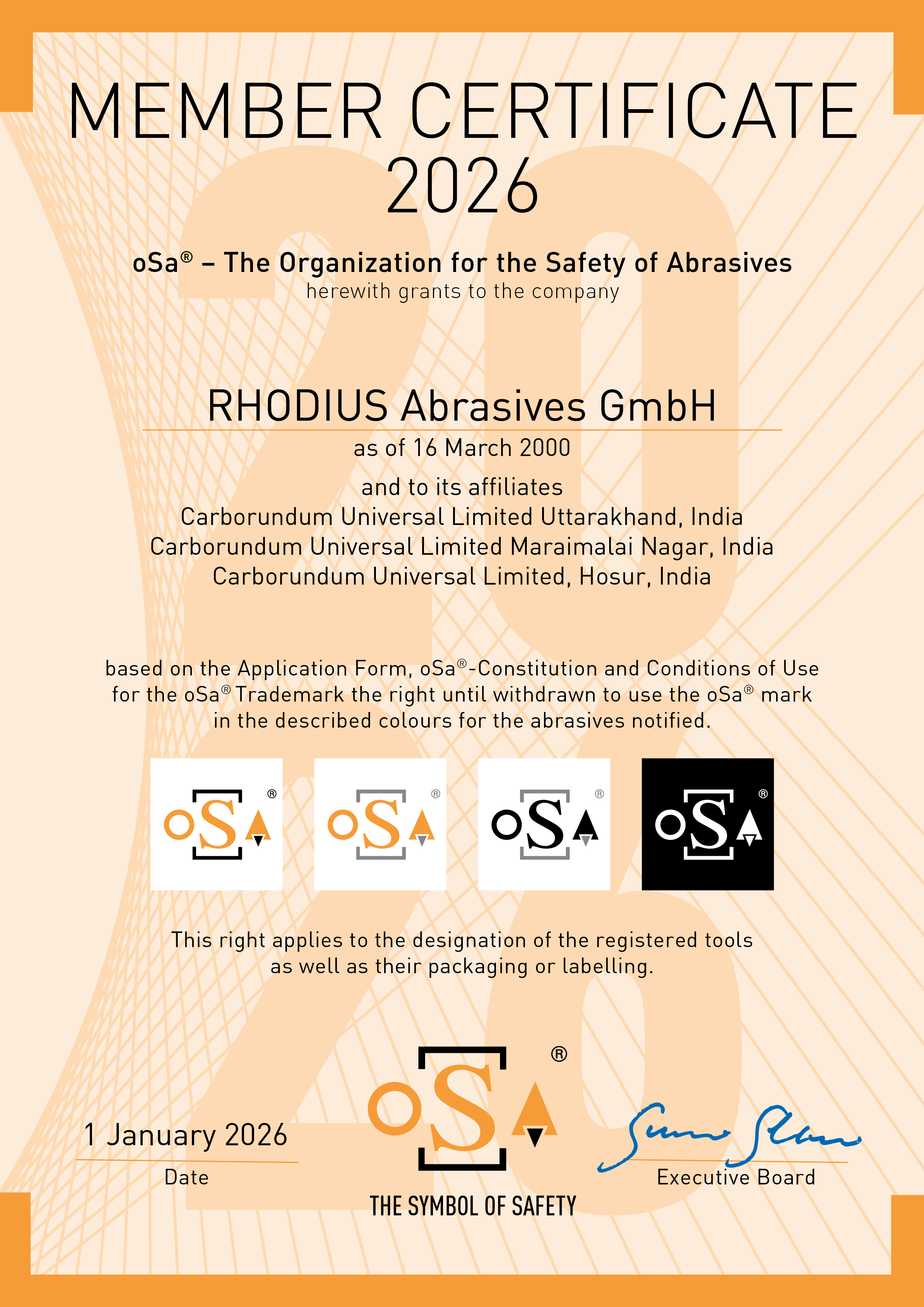 CUMI Abrasives is a certified member of oSa® (The Organisation for the Safety of Abrasives) for the year 2026. This certification affirms our commitment to the highest international safety standards in the design, manufacture, and labelling of abrasive products. The oSa® membership authorises the use of the oSa® safety mark on registered abrasive tools manufactured by Carborundum Universal Limited across its facilities in India, ensuring safe usage, reliable performance, and compliance with global safety norms.