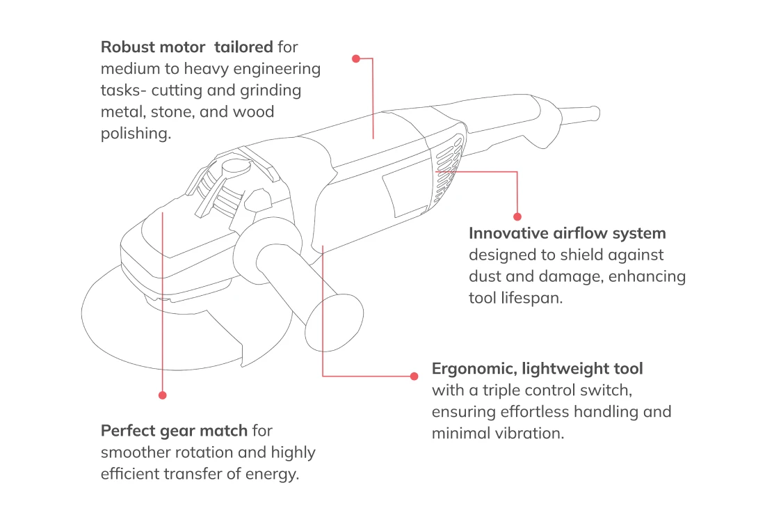 The CUMI CAG 180 Elite is a powerful 180mm angle grinder designed for seamless metal cutting, grinding, and polishing. Its high-torque motor and ergonomic build ensure durability, efficiency, and precision—perfect for construction, fabrication, and industrial applications.