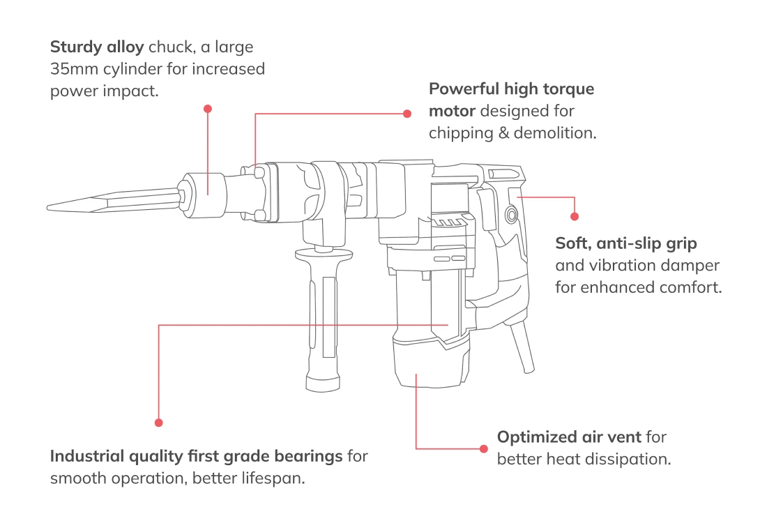 The CUMI CPCH 08-1100W professional series rotary hammer delivers robust drilling performance in concrete, steel, and wood. Featuring a high-torque motor, forward/reverse rotation, steel clamp chucks, and a 360° adjustable handle, it’s perfect for heavy-duty construction, masonry, and renovation projects.