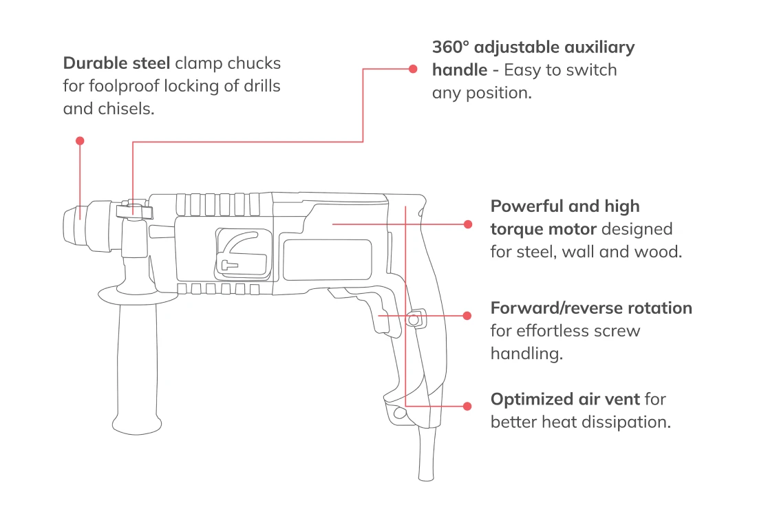 The CUMI CPHD 20-500W professional series rotary hammer is engineered for precision drilling in concrete, steel, and wood. Its high-torque motor, forward/reverse rotation, and durable steel clamp chucks ensure smooth operation. The 360° adjustable handle provides superior control, making it ideal for heavy-duty construction, masonry, and renovation projects.