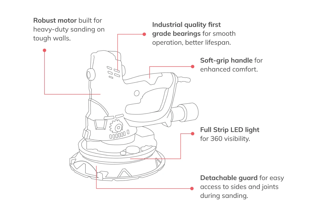 The CUMI CPWS 7-850W professional series wall sander is built for heavy-duty sanding on tough wall surfaces. Equipped with industrial-grade bearings, a soft-grip handle, and a detachable guard for precision work, it ensures seamless operation. The 360° LED lighting provides full visibility, making it ideal for professional drywall finishing.