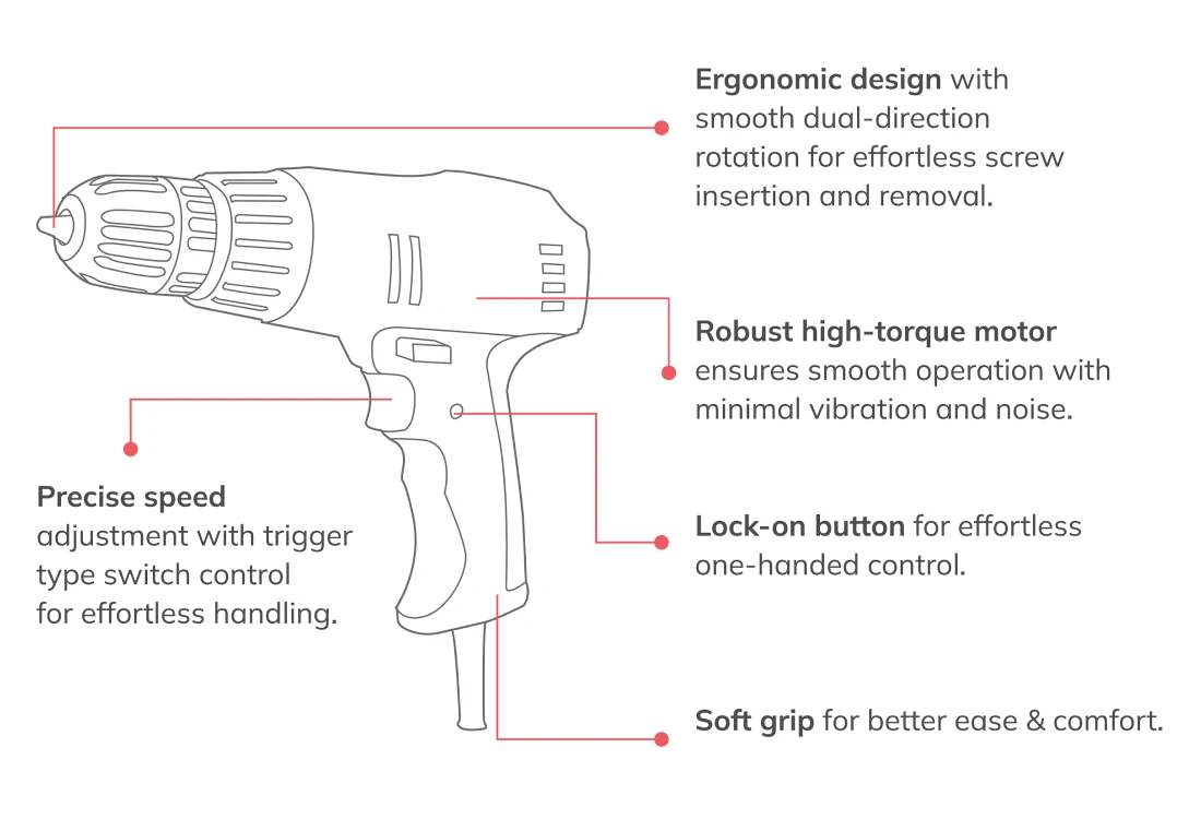 The CSD 010 electric screwdriver delivers 280W of power, 12.5Nm torque, and 0-800 RPM for smooth, effortless screwdriving. Featuring variable speed control, an ergonomic soft grip, dual-direction rotation, and a lock-on button, it ensures minimal vibration and noise.